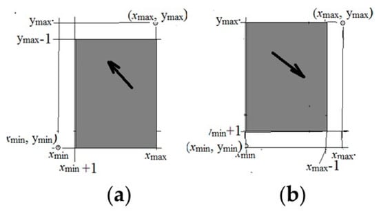 The range of values (x,y) for conditions Equation (7) is shaded, where and are maximum values, and are minimal values. (a) A case illustrating condition Equation (9); (b) A case illustrating condition Equation (10).