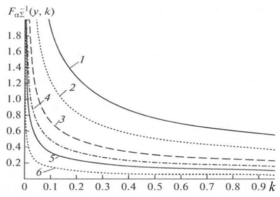 where is the function inverse to with respect to the first variable (the monotonic increase in of the function is taken into account). Note that the dependence of the interval on appears through and . The graphs of functions [] depending on the parameter for different are shown in Figure 4. There is also an approximate solution of Equation (16) for obtained by expanding in powers of small []: