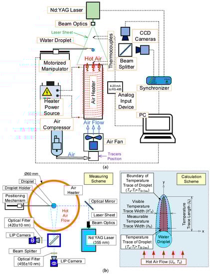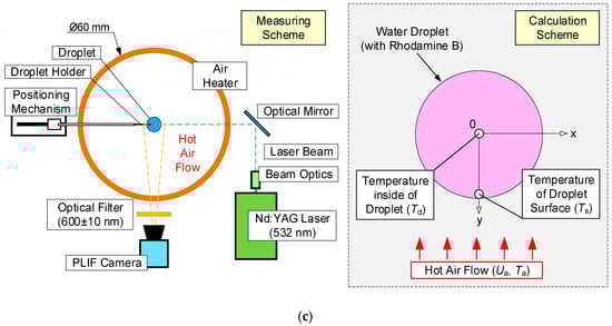 - Volkov, R.S.; Strizhak, P.A. Planar laser-induced fluorescence diagnostics of water droplets heating and evaporation at high-temperature. Appl. Therm. Eng. 2017, 127, 141–156. [Google Scholar] [CrossRef]