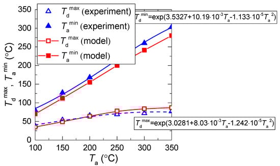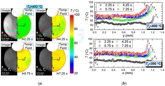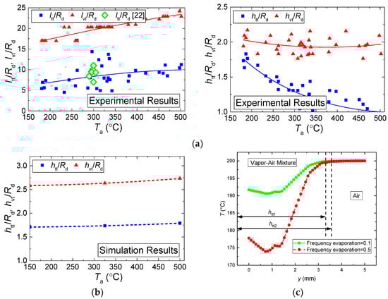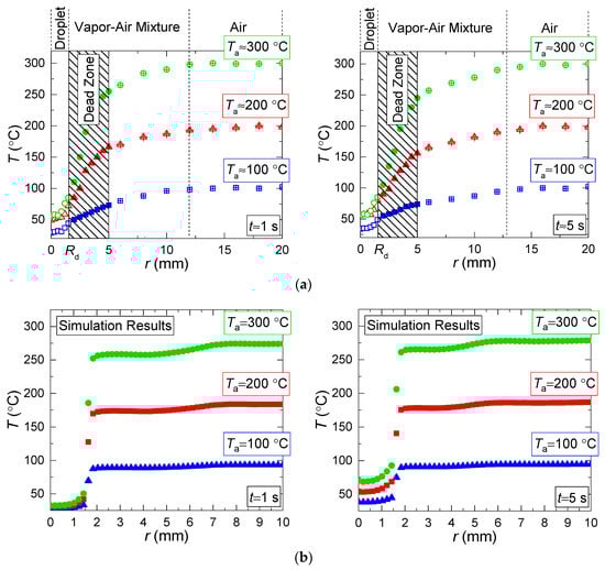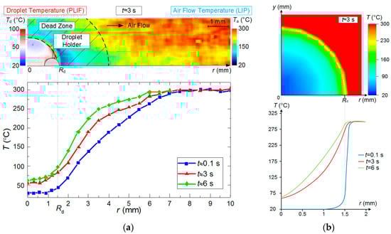 - First, the limitations of LIP in the recording of the temperature of the gas-vapor mixture around the droplet (Figure 5) have been established and viability of using the model from [22] is shown to correct the gas-vapor mixture temperature around the water droplet surface (i.e., in the dead zones of LIP). In general, applying interpolation and extrapolation methods, we can use the experimental points obtained with LIP in the gas-vapor area and with PLIF in the droplet to predict the temperatures in the gas-vapor layer around the droplet. Figure 5a,b shows that the temperature profiles in the experiments and when modeling are also in good agreement for the areas where it is impossible to plot reliable experimental fields; the prediction can be made using temperature distribution obtained by means of the model. These procedures were used when plotting such temperature distributions in Figure 6 with experimental values Td and Tg. Figure 7 shows that the absolute maximum temperature values in reference points coincide.