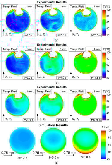 - Second, we clearly show the unsteady changes of temperature fields of heated and rapidly-evaporating water droplets (Figure 5 and Figure 7). A similar conclusion was made from the experimental results in study [31]. This factor is extremely important and determines the conditions and characteristics of water droplet heating when energy is supplied and spent on the phase transition. Traditionally, assumptions are made [12,13,14,15,16] that all the energy supplied to the water droplet surface is spent on the phase transition, and the process of its heating is not decisive. However, the temperature fields obtained illustrate that a water droplet has a highly inhomogeneous temperature field for a long time (temperature variations can be 70 to 80 °C). Therefore, it is important to take this factor into consideration in the mathematical modeling. The temperature fields, obtained when combining the results of processing using LIP and PLIF, show that the supplied energy is spent not only on the phase transition but also on heating the water droplet and the gas-vapor mixture. The heating of the gas-vapor mixture is a complex process: on the one hand, the energy of the air flow is spent on the heating of relatively cold vapors injected from the droplet surface, and on the other, the water vapors are known to contribute to additional radiation. Hence, in actual operating conditions, the vapors forming in the near-surface layer of an evaporating droplet strengthen the radiative heat exchange.
