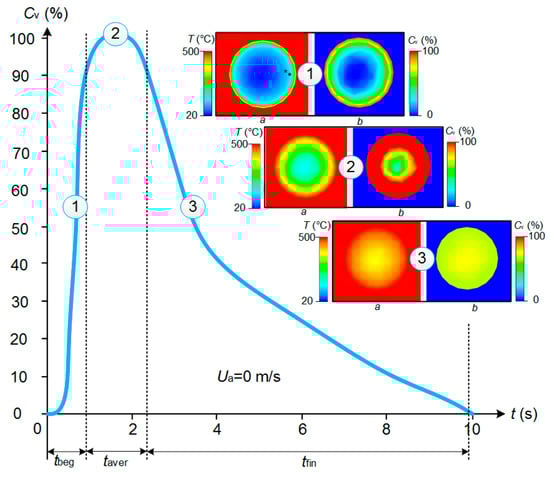 3.1. Unsteady Temperature Fields of an Evaporating Droplet and Gas-Vapor Mixture around It