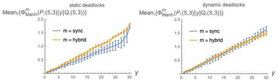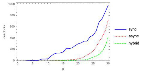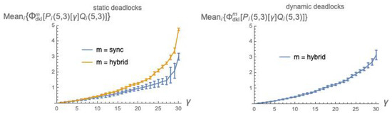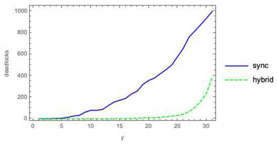 In Figure 7, we plot the values of as a function of the coupling factor , each point obtained by averaging over 10 pairs, using static deadlocks (for the sync and hybrid modes) and dynamic deadlocks (only for the hybrid mode).