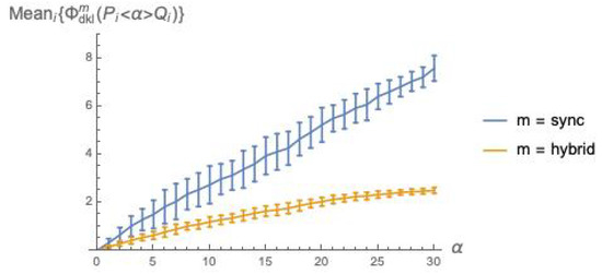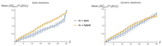 Before presenting the plots, we need to deal again with static vs. dynamic deadlocks (Section 4.2). Referring to the sync mode, s with dynamic deadlocks turn out to be inappropriate for computing , since they would re-introduce the -mismatch problem that we have managed to rule out by switching to the cooperation mechanism! The reason is that a static deadlock is made dynamic by adding a “1” on the diagonal of , at an otherwise null row. This entry is unlikely to find a non-zero counterpart in , since (i.e., ) has no deadlocks—no 1s added on the diagonal—and the only possibility to have a non-zero entry on the diagonal is that an actual loop-transition be possible for that system. However, when P and Q are executed in sync mode, this is unlikely, both when they operate in interleaving (i.e., when only one of them updates all its nodes) and, even worse, when they synchronize (i.e., when all nodes of P and Q are updated). Thus, for the mode, the option is to use static deadlocks—no 1s added on the diagonal of . As observed above for the composition, the weights in Equation (22), will in general not total 1, and must be re-normalized.