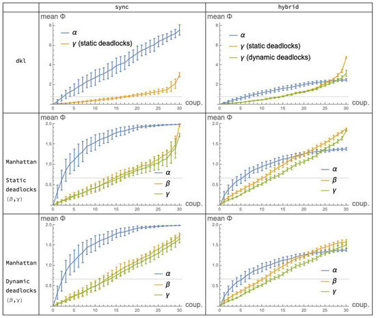 As stated initially, our interest is primarily in the comparison of cooperation mechanisms (i). It is then useful to aggregate the statistical data collected in the previous sections so that the plots for , and appear in the same diagram. This is done in Figure 9 which shows, for each fixed choice of execution mode (the columns) and distance function (the rows), the “performance” of the applicable mechanisms in terms of integrated information, as a function of the coupling factor (“coup”). Note that Manhattan distance is represented in Rows 2 and 3, corresponding to systems implementing, respectively, static and dynamic deadlocks: this distinction only affects the and plots, since the mechanism is immune to deadlocks. For convenience, the plots in Row 2 are replicated in Row 3. (Recall also that the dkl-mismatch problem prevented us from applying distance to the mechanism.)