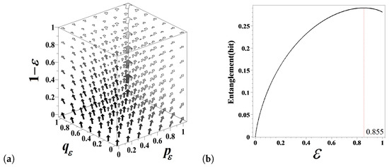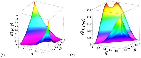 The integrand in Equation (20) turns to zero when the probabilities are independent of one another (as ) but equals the doubled Kullback–Leibler divergence (relative entropy) [24] between p and (q and ) as (due to the obvious symmetry of expressions). The degree of probability entanglement defined by Equation (20) attains the maximum value at (Figure 4b).