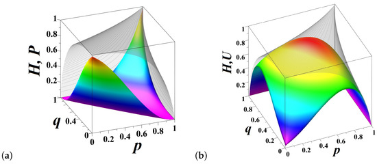 (a) The entropy (transparent) and predictable information (hue colored) in the model of a biased coin for the different values of p and q; (b) The entropy (transparent) and unpredictable information (hue colored) for the different values of p and q.
