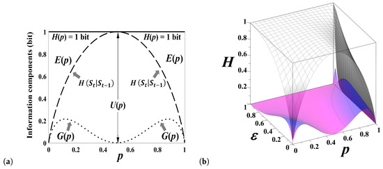attains the maximum value, bit, uniformly for all . On the contrary, flipping the coin when (or ) generates the stationary sequences of no uncertainty, (see Figure 1). In Equation (3) and throughout the paper, we use the following conventions reasonable by a limit argument: . The information difference between the amounts of uncertainty on a smooth statistical manifold parametrized by the probabilities p and q is calculated using the Fisher information matrix (FIM) [22,23,24], viz.,