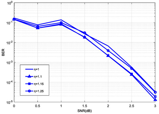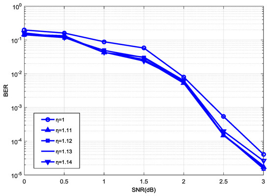 In order to make Figure 3, Figure 4 and Figure 5 clearer, we omit other poor performance curves. Figure 3 shows the effect of decoding performance with different normalization factors under the range of with a step size of = 0.05. Figure 3 shows that we can achieve the best decoding performance when = 1.1, and the decoding performance was low when was between 1 and 1.25. We set = 1.1 as the center to find a more accurate . In Figure 4, we achieved the best decoding performance when was between 1.11 and 1.14. Considering that addition will reduce more logic resource consumption than multiplication in a hardware simulation, we can change the multiplication of and the function max* into an addition of the max and its shift value. But addition can only be performed when the fractional part of the normalization factor η is (). Since the fractional part of the normalization factor is constrained as the form of () (e.g., 1.5, 1.25, 1.125, etc.), there are not many legal options for this factor. In our work, the value of normalization factor is taken as 1.125.