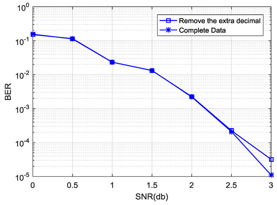 Figure 5 shows the effect of decoding performance under the normalization factor with different ranges, where we define . In Figure 5, the decoding performance is better when and , and the decoding performance with is better than that with a signal noise ratio (SNR) from 1.5 to 2.8 dB. Considering decoding performance with a medium to high SNR, the range can be determined as . Therefore, the Nor-Log-MAP algorithm can be rewritten as Equation (13). In the hardware simulation, Equation (13) can be realized by Equation (14) after binary conversion, where can be computed by intercepting the corresponding data based on selected bit width and the number of decimal digits. During the hardware simulation, 7-bit channel information is used, where 5 bits are integers and 2 bits are decimals. When computing, the data part that exceeds two decimal places is removed, however this results in performance loss. As can be seen from Figure 6, there is a little gap between the removed extra decimal places and the complete data in decoding performance. We also know that hard decision in turbo decoding relates to the sign bit of information directly rather than the absolute value of the data. In this way, the algorithm can replace multiplication with an addition operation, and will reduce some logic resource consumption compared with the lookup table method.