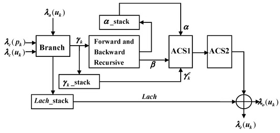 The decoding process of turbo codes in SISO is shown in Figure 8 [14,15]. Firstly, received system information , check information and priori information are used to compute , , and Lach in the branch unit. Then, we use a generated branch metric and initialized value and to compute the new and through a forward and backward recursive (FBR) unit. Finally, add compare select 1 (ACS1) and ACS2 are used to compute posteriori information and external information [16,17].