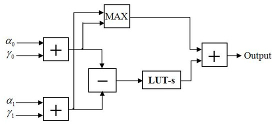The function is a nonlinear calculation in Equation (8) that will consume lots of logic resources in decoder design, so we need to simplify the function in max*. In [4,5], two commonly used algorithms for approximating the nonlinear function are as follows: