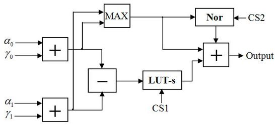 In [10], Sun et al. proposed FFU to compute the metrics of every state. The structure of the FFU is shown in Figure 10, where the input signals of the module are and during the forward-state metric computation. In order to satisfy the proposed LUT-Nor-Log-MAP algorithm, we designed an NFU based on the FFU, which is applicable to all state metric calculation at the same time. The structure of the NFU is shown in Figure 11. The operation of the lookup table unit and the normalization unit are controlled by control signals (CSs). LUT-s and Nor represent lookup table approximation and the normalized approximation for function , respectively. Hence, it is possible to adopt different approximation methods for satisfying the forward-state and backward-state metrics, as well as posteriori information and external information computation.