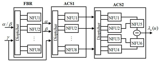 Figure 12 shows the rule of the state trellis transition of the turbo decoder under the time division long term evolution (TD-LTE) standard. In order to satisfy the eight-state transition rule of the turbo trellis network in the decoding process [19,20], the FBR unit calls eight NFUs, and the ACS1 and ACS2 units call eight and six NFUs, respectively. The structure of the modified SISO unit is shown in Figure 13. Each NFU will complete the calculation of max* one at a time. As can be seen from Figure 11 and Figure 13, for the eight-state turbo code with TD-LTE standard, a codeword for each turbo code needs at least 16 LUTs for the calculation of forward-state and backward-state metrics [21], and an external or posteriori information bit requires 14 LUTs for max* operation. As the degree of parallelism increases, the number of LUTs increase with the same multiple. Therefore, in hardware implementation, the proposed LUT-Nor-Log-MAP algorithm can transform the required 14 LUTs operation per bit into addition operations during turbo code decoding, and thus reduce logic resource consumption.