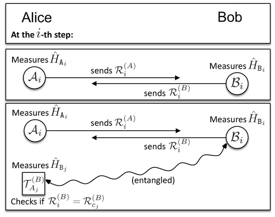 - The sets of Alice’s measurement results, , and those sent to Alice by Bob, . Note that in the case of Bob’s cheating, might contain the wrong values, and in case the communication was interrupted at step m, it is only a partial set of results. For simplicity, we use the same symbol for both sets of “honest”, as well as “dishonest” results.