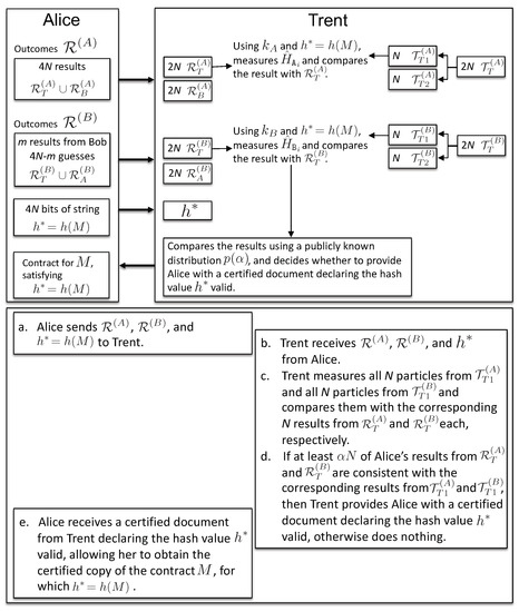 - During the binding phase, a single client, say Alice, presents her results to Trent in order to bind the contract, to receive a certified document, signed by Trent’s public key, declaring valid the hash value . Having such a certificate, Alice can appeal to the authorities to enforce the terms of the contract M: she presents the contract M and the signed document declaring the value valid, so that the authorities can verify that indeed (note that the function h is publicly known). As pointed out in the Introduction, Trent is an agency accredited by the State (e.g., public notaries). To bind the contract, Alice provides the string to Trent and presents her results , as well as those obtained from Bob, (if the protocol was interrupted before its completion, Alice will guess the rest of Bob’s outcomes; see Appendix for details). Knowing , Trent computes and . Trent thus measures the honest observables on N randomly-chosen qubits from the subset and on another N randomly-chosen qubits from (the other particles are kept for binding the contract for Bob, if requested). He also chooses independently at random , according to some publicly-known distribution . Trent will give to Alice a certified document declaring the hash value valid (“bind the contract for Alice”) if the results and satisfy the following two conditions: