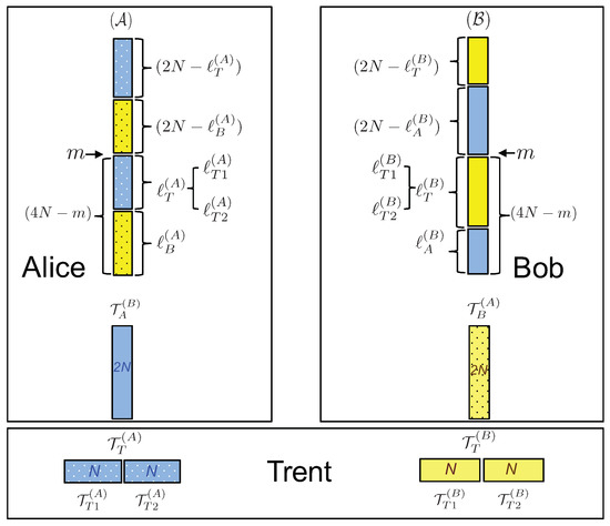 Thus, Trent’s qubits are each divided into two equal subsets of the same size, and : the sets with the subscript are used for binding the contract to Alice, while those with for Bob. Consequently, we have and (see Figure 5).