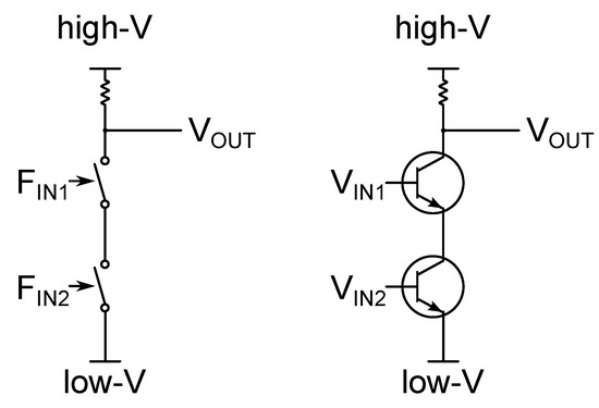 Universal logic gate NAND. (Left) The logic output OUT is here associated with an electric voltage value across a simple circuit: high-V corresponds to the logic state 1 and low-V corresponds to the logic state 0. Binary switches are represented here as mechanical switches that can assume the logic state “0” (physical state open) or the logic state “1” (physical state close). When both the switches are in the close position, the circuit behaves as a simple conductor and the voltage position assumes the value low-V. (Right) Logic gate NAND implemented using transistors as binary switches. In this case, both the input logic state and the output logic state are physically encoded into electrical voltages.