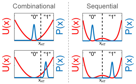 with a properly chosen threshold value. In Figure 2, we illustrate the two potentials with the associated probability densities corresponding to the logic states 0 (left) and 1 (right).