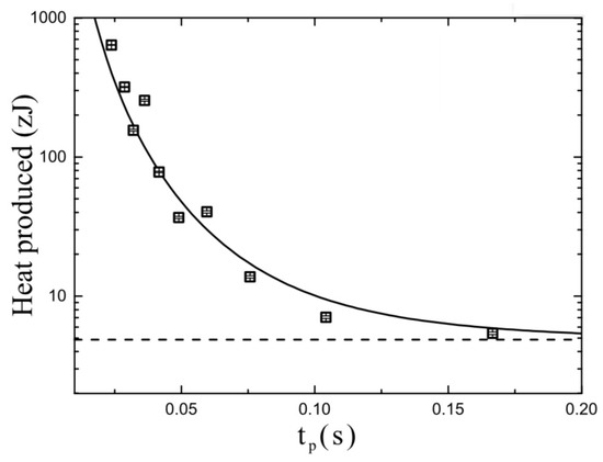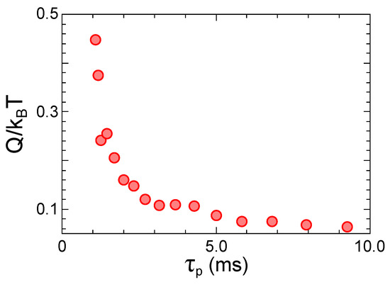In Figure 6, we show the measured values of Q required to perform a single refresh operation as a function of the protocol time , for fixed and . We can see that Q approaches the minimum value given by Equation (8) when increases towards the quasi-static protocol condition. In a practical memory, such a condition is clearly attainable only if the required protocol time satisfies the given condition .