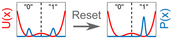 As we have previously mentioned, the equilibrium condition of according to (3) and (5) is represented by a symmetric probability density , where (see Figure 4, left). In order to store a binary digit, we need to set our memory in a given state, 0 or 1. This operation requires a change in the probability density that becomes entirely confined within one well of the potential. In Figure 4, we show the change in for the reset to 0 operation. Here, we have to deal with the heat exchanged with the thermal bath because the system entropy at the beginning and at the end of the switch is not the same. It is easy to show that the required change in entropy is and thus a minimum net contribution of is required. Such a work is realised by the deterministic force. Finally, the dissipative work done by the frictional force can be reduced to zero if a proper adiabatic protocol is followed.