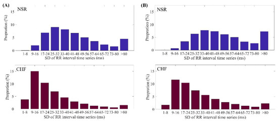 Distribution ranges of SD values of RR intervals for NSR and CHF groups when (A) N = 300 and (B) N = 1000.