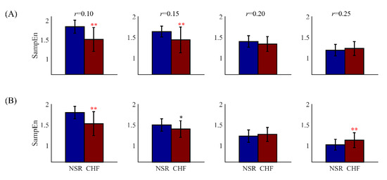 The distribution ranges of SampEn between NSR and CHF groups at different setting of tolerance threshold when (A) N = 300, m = 2 and (B) N = 1000, m = 2. The symbol ‘*’means statistical significance p < 0.05 and ‘**’means statistical significance p < 0.01, using t-test.