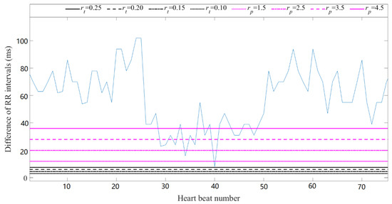 When the physically meaningful r was applied to time series, the direct and effective relation between RR intervals and threshold was presented. This is shown in Figure 3 using a CHF subject as an example. The values were 0.10, 0.15, 0.20 and 0.25, and values were 12 ms, 20 ms, 28 ms and 36 ms, which were presented as a cut point of sampling period (8 ms) in the legend. As shown in Figure 3, for most of time, was mostly below the minimum time difference of RR intervals, explaining why SampEn did not change over various . However, the magenta lines of intersected the curve of RR interval time difference more frequently, leading to the significant entropy variance as changed.