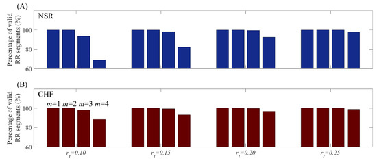 When the product of threshold and SD is smaller than most time difference of RR intervals, it leads to two outcomes. If the product is larger than a sampling period, the SampEn value is valid, otherwise it is not. Since time series with slight heart rate variation is common in clinical data, changing value makes SampEn results unpredictable. Figure 4 shows the percentage of valid RR segments at m = 1, 2, 3 and 4 combined with from 0.10 to 0.25 under N = 300. Although for m = 1 and 2, all RR segments presented valid entropy results, the increase of m might lead to invalid values at certain proportion for both NSR and CHF groups. In contrast, is directly determined by multiples of sampling period, which possesses certain matching degree to the time series, thus avoids invalid values in entropy calculation fundamentally.