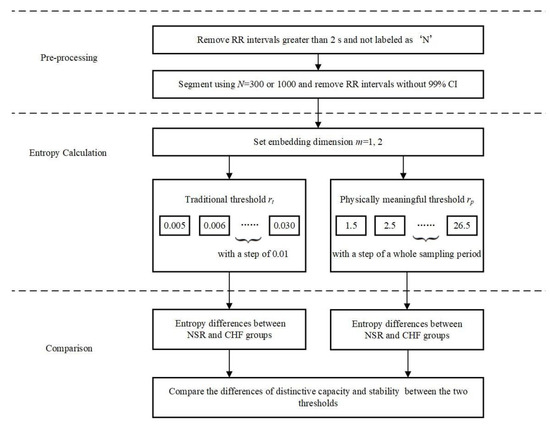 Figure 5 shows the block diagram of the evaluation process for CHF detection used in this study. It consists of three major steps. Equation (1) pre-processing and segmenting for each RR interval recording; Equation (2) entropy calculation for each RR segment with different combinations of parameters; and Equation (3) comparison between NSR and CHF groups to determine whether SampEn with physically meaningful threshold is better than the traditional SampEn.