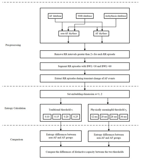 Figure 6 shows the block diagram of the evaluation process for AF analysis used in this study. Likewise, it also consists of three major steps. Equation (1) pre-processing and segmenting for each RR interval recording; Equation (2) entropy calculation for each RR segment with different combinations of parameters; and (3) comparison between non-AF and AF groups to determine whether SampEn with physically meaningful threshold is better than the traditional SampEn.