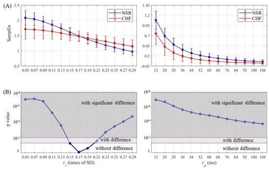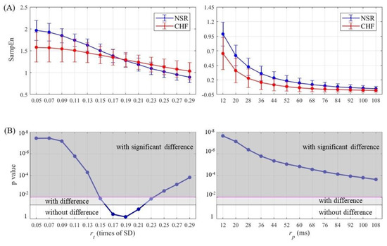 Entropy calculation and statistical analysis contrasting (left) with (right) between NSR and CHF groups at N = 300 and m = 2 for (A) SampEn results and (B) statistical significance.