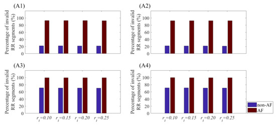Percentage of invalid RR segments for the four values of in the RR Interval Databases for classifying AF and non-AF subjects. Different combinations of m and BWL were used: (A1) For m = 1 and BWL = 30, (A2) m = 1 and BWL = 60, (A3) for m = 2 and BWL = 30, and (A4) for m = 2 and BWL = 60.