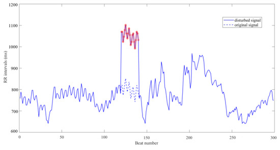 In order to further explain the simulative artefacts added to ECG signals, we considered the signal from the first RR segment of the CHF subject numbered 201 as an example and calculated its SampEn at N = 300 and m = 1 using and , respectively. In account of the ability to detect CHF in operation, was set as 0.15 and as 36 ms. Then we added 200 ms to its heart beats from number 121 to 140, and the whole RR segment containing 300 heart beats was showed in Figure 10. As the figure indicates, a DC drift was applied to the signal, thus the change in SampEn result of this RR segment might influence the average value of the subject. Under this situation, we calculated the SampEn values again and compared their variation. When using , the original SampEn result was 0.0388 and the impacted one was 0.0517, which was a 33% increase of the previous value. Meanwhile, when was applied, the original SampEn result was 0.4719 and the drifted one was 0.4635, indicating the latter decreased only 2% when compared to the former. When more subjects from the database were tested, the same outcome that changed at a lower rate still appeared.