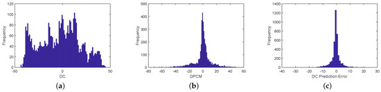 Comparison of different histograms. The proposed DC prediction error histogram has the highest peak and the smallest entropy. (a) DC histogram; (b) DPCM DC histogram; (c) DC prediction error histogram.