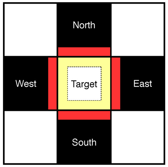 where , the pixel from the neighboring block, and , the pixel from the target block, are exactly one position away from each other. In Figure 5, is exactly one position away from , but is two positions away from and .