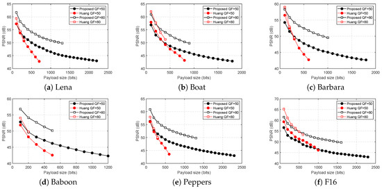Figure 6 summarizes the PSNR comparison: “Huang QF = 50” represents the result when Huang et al.’s method is used to embed in the QF = 50 image, and “Huang QF = 80” represents the result when Huang et al.’s method is used to embed in the QF = 80 image. Same notation applies for the proposed method.