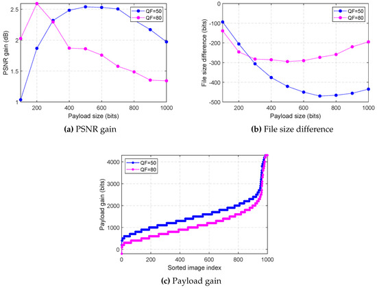 In this section, performance comparison using Alaska image data set is summarized. Unlike the earlier comparison which compared specific images, the comparison here uses 1000 images to compare using more robust statistical results. For the comparison, PSNR gain, file size difference, and payload gain are compared.