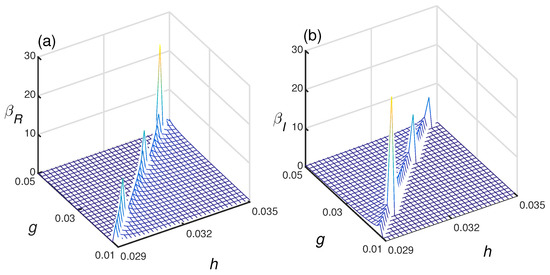 To demonstrate the relation between the Berry phase and DPT around the YLES, the real and imaginary parts of the Berry phase as a function of the Hamiltonian parameters g and h are plotted in Figure 2a,b. The lattice size is , and the YLES points lies approximately along the line of , which is determined by the order parameters defined as and with [24,25,26,27]. From Figure 2a,b, we can see that both and show anomalies around the YLES points, which demonstrates that the complex Berry phase can detect DPT.