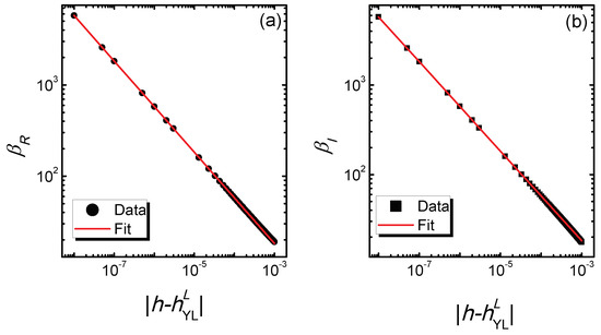 where , , and are the usual critical exponents for the 2D classical Ising universality class, s is the (1 + 1)D FPPT critical exponent for the Berry phase, and and are scaling functions. However, from Equation (5), one finds that and at the YLES points , due to being negative. That is, at the YLES points, the scaling functions of Equation (6) become: