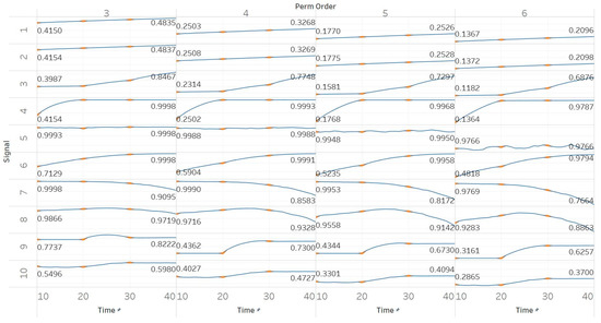 Synthetic signals entropy results using permutation entropy (Pen) with permutation order (Perm Order) n equal to 3, 4, 5, and 6. Numbers on the y axis correspond to the synthetic signals: (1) Constant amplitude chirp signal; (2) modulated amplitude chirp signal; (3) signal with increasing number of harmonics; (4) quasi-periodic signal with increasing noise power; (5) WGN of increasing power; (6) WGN of increasing bandwidth; (7) MIX process; (8) AR process; (9) logistic map; (10) Lorenz system. For each synthetic signal and figure, the numbers represent the first (at t = 10 s) and final (at t = 40 s) entropy values, while the orange dots correspond to the time stamps when the parameters from the synthetic signals change (t = 10/20/30 s).