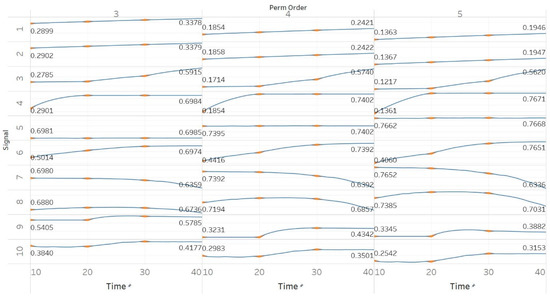 Synthetic signals entropy results using modified permutation entropy (MPEn) with permutation order (Perm Order) n equal to 3, 4, and 5. Numbers on the y axis correspond to the synthetic signals: (1) Constant amplitude chirp signal; (2) modulated amplitude chirp signal; (3) signal with increasing number of harmonics; (4) quasi-periodic signal with increasing noise power; (5) WGN of increasing power; (6) WGN of increasing bandwidth; (7) MIX process; (8) AR process; (9) logistic map; (10) Lorenz system. For each synthetic signal and figure, the numbers represent the first (at t = 10 s) and final (at t = 40 s) entropy values, while the orange dots correspond to the time stamps when the parameters from the synthetic signals change (t = 10/20/30 s).