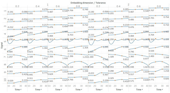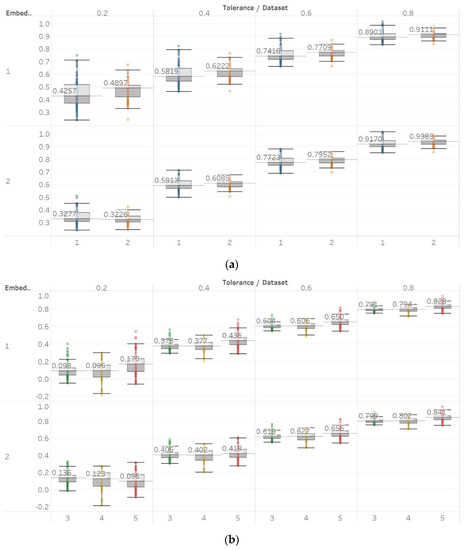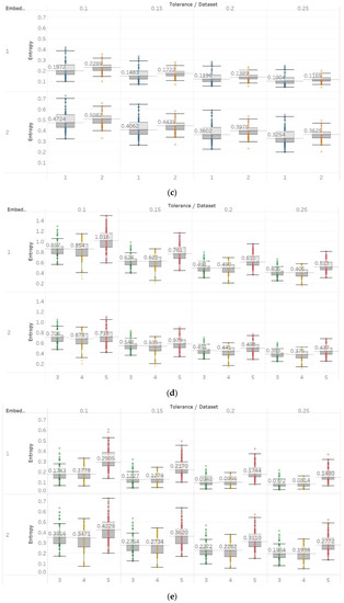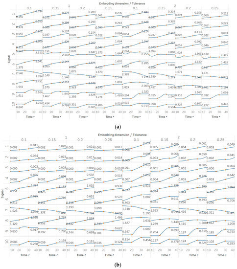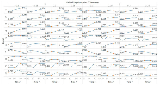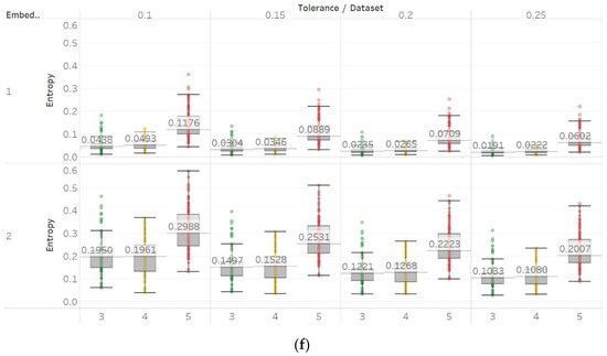 These observations are consistent with the relevant literature, in which similar synthetic signals were analysed using Lempel–Ziv complexity (LZC), ApEn, auto-mutual information rate of decrease (AMIRD) and SEn [28,32,33,34]. However, although LZC produced similar results to our study, it failed to detect changes in a signal with an increasing number of harmonics, unlike the entropy algorithms analysed herein. Moreover, the study with AMIRD provided identical results for the AR and MIX process signals, while it could only detect changes in a Lorenz system in the window that contained both chaotic and periodic behaviour, similar to results obtained using SEn of m = 2 (Figure 4).