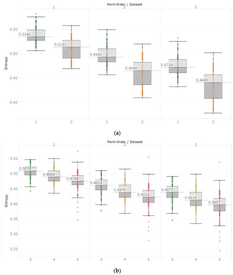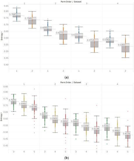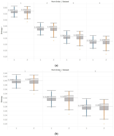 For PEn, a difference between the means of data set 1 and data set 2 (group A) could be observed (Figure 7). This difference is consistent among all values of permutation order n, with data set A resulting in higher entropy values than dataset B. This observation is explained by the alpha rhythm appearance in the event of closing the eyes (data set 2). Alpha rhythms are generally more regular and slower (10 Hz) and, therefore, could be associated with lower values of PEn [6]. Accordingly, for the intracranial EEG recordings, higher entropy values were obtained. More specifically, in data set C, we observe the highest values, as it is made of data recorded from the opposite hemisphere of the epileptogenic zone; therefore, maintaining the irregular behaviour of a normal EEG. In contrast, data set D produces slightly lower values, as the epileptogenic zone tends to produce more defined signal patterns, while, data set E produces even lower entropy values, as it includes epileptic seizures in the EEG segments, which are generally more regular and repeating patterns in terms of their rank sequence [6]. Finally, all results significantly reject the hypothesis () for both groups and all values of n. To further examine for pairs of distributions in group B, Mann–Whitney U tests were also performed for each possible pair of data sets. Results reject the hypothesis of equal medians for all values of n and all three pairs of data sets (Supplementary Material, Tables S1–S3).
