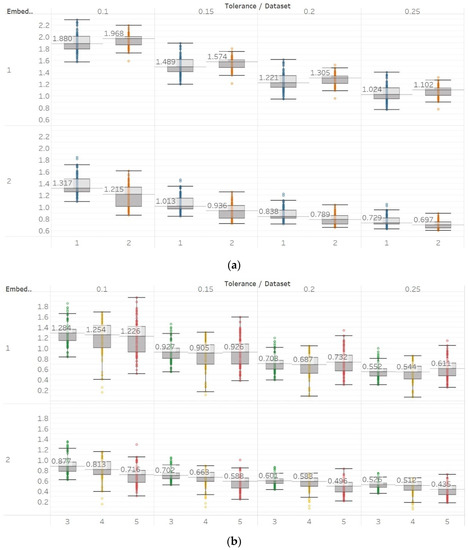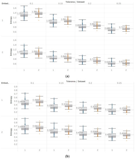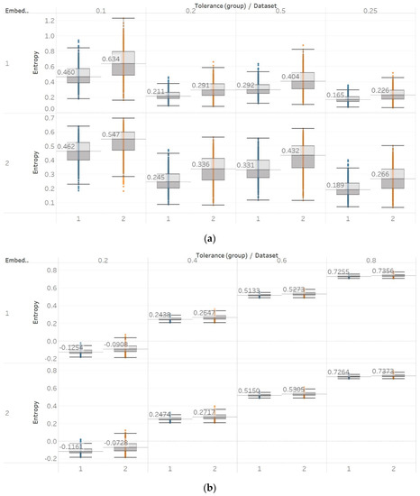 Electroencephalogram and epilepsy study (II) results: (a) PEn; (b) MPEn. Data sets: (1) Focal EEGs; (2) non-focal EEGs.