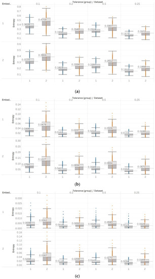 Finally, FEn also produced similar results to those of SEn and QSEn, especially for n = 1 (Figure 14). The FEn of non-focal EEG segments is evidently higher compared to focal signals. This is also enhanced by the fact that while this difference is similar to those observed by the previous algorithms, the variances of populations appear to be considerably smaller. This would render FEn a better candidate for classification as there would be less overlap between the entropy values of the two data sets. Moreover, the differences between focal and non-focal x signals are statistically significant () for all combinations of input parameters (Supplementary Material, Table S4). However, using n = 2 or n = 3 is not recommended, as both choices produce a lot of outliers while pushing the entropy values very close to zero as well.