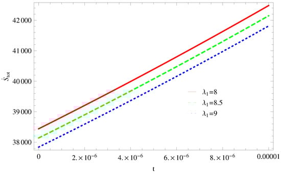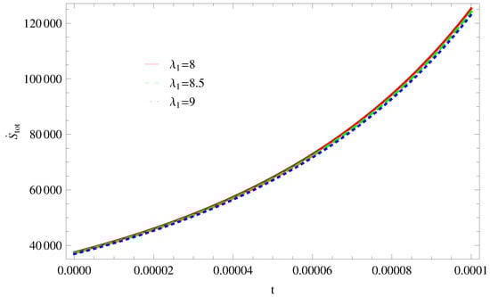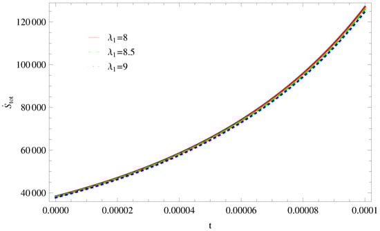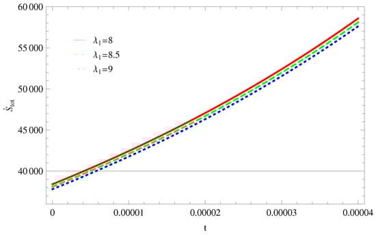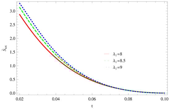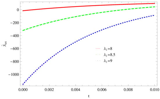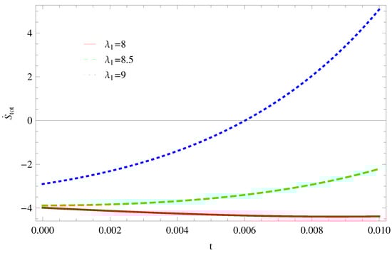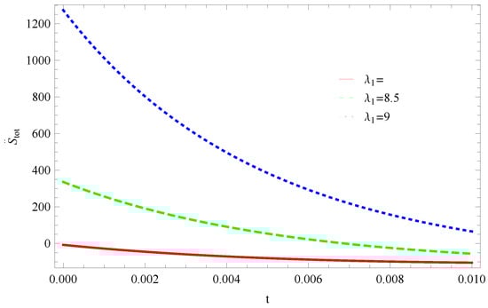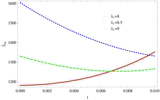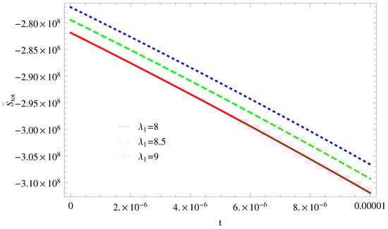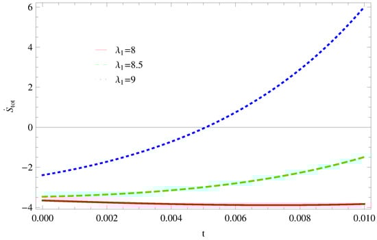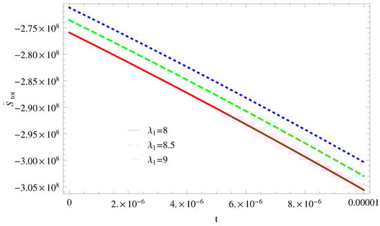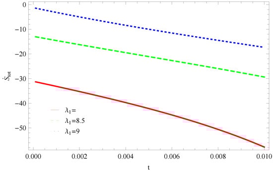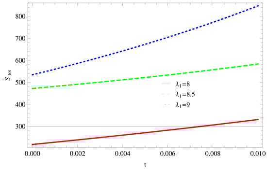 Figure 14. Plot of versus t for model 1. - For Model 2:The left side trajectories increasing positively at present epoch as well as later epoch with the increasing values of t, for all constant parameters, which shows that the GSLT is valid (Figure 15). With the same values of all parameters, the thermal equilibrium condition satisfies, as all trajectories decreases at present as well as the later epoch and remain in the negative phase for (Figure 16).