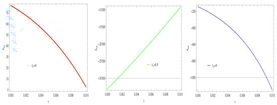 Figure 16. Plot of versus t for model 2. - For Model 3:Figure 17, demonstrate that by taking the same values of and for , GSLT preserved the validity in the later epoch while remains invalid for other two cases of . In Figure 18, we plot three graphs for in first graph for shows that trajectory decreasing towards positive direction at present as well as later epoch, for the trajectory is remain in negative phase at present epoch as well as later epoch and for the trajectory decreasing negatively. Hence, the thermal equilibrium condition satisfies for and is invalid for the case