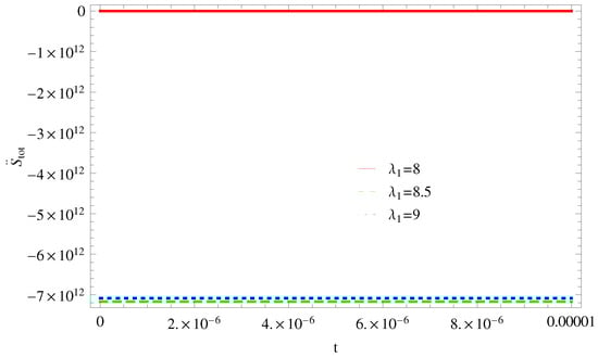 Figure 22. Plot of versus t for model 2. - For Model 3:Figure 23, for , GSLT preserved the validity in the later epoch while remains invalid for other two cases of by taking the same values of all parameters. Figure 24, demonstrate that with the same values of all parameters the thermal condition cannot satisfies for all cases of at present epoch as well as later epoch as all trajectories remain in the positive phase.