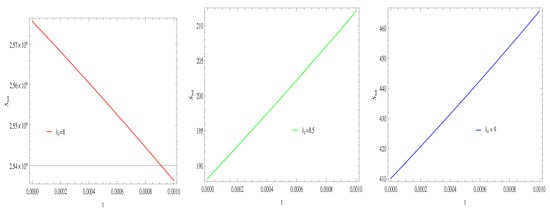 Figure 20. Plot of versus t for model 1. - For Model 2:In Figure 21, by taking the same values of and for all cases of all trajectories remain in the positive phase at present as well as later epoch which demonstrate that the GSLT is valid. In Figure 22, the trajectory remain constant in positive phase which cannot preserved the thermal condition and for other two cases trajectories remain constant in negative phase which confirms the thermal condition.